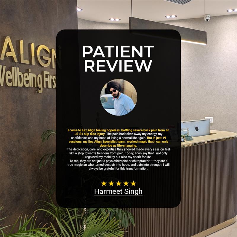 EXCELLENT Based on 240 reviews Posted on Naresh TandonTrustindex verifies that the original source of the review is Google. I had been suffering from pain in both my wrists, and after consultations at Fortis and Max Hospitals, surgery was recommended. I decided to try physiotherapy first, and thanks to the dedicated team working under Dr. Isha Sahdev especially Dr. Gayatri Rao, who closely managed my sessions—I experienced remarkable improvement. The care, attention, and professionalism shown throughout my treatment were outstanding. After about 30 physiotherapy sessions, my pain has significantly reduced, and I now feel more than 80% recovered. In fact, I’ve completely dropped the idea of surgery. My body alignment and posture have also improved noticeably, and I’m very happy with the progress. I’m truly grateful to Dr. Gayatri Rao and the entire team for their support throughout my recovery journey. I highly recommend them to anyone seeking effective physiotherapy and long-term recovery support. Eez Align therapists are professional, knowledgeable, and truly cares about their patients. They tailored a treatment plan that really helped my recovery, and their support made each session productive and encouraging. Highly recommended!Posted on Alok SinhaTrustindex verifies that the original source of the review is Google. It took some time but their methods have significantly relieved my shoulder pain. What I really liked is that while there is a focus on addressing the immediate pain, there is a greater focus on identifying and addressing the root cause. Their treatment mix of Chiropractic and Physio has worked well for me. Thank you Shah Rukh, Rajat and Dr. Isha for putting my shoulder onto the path of recovery. And Anjali for your efficiency at the front desk.Posted on Pushpak RayTrustindex verifies that the original source of the review is Google. Steady and gradual improvement over the last 7-8 months.very satisfactory progressPosted on Gaurav JaiswalTrustindex verifies that the original source of the review is Google. Dr Isha has helped me regain confidence by healing chronic ailments. I highly recommend the clinic that supports and maintains hygiene.Posted on Kamini BhandariTrustindex verifies that the original source of the review is Google. I came to Eez Align with pain in my legs and lower back and have found their diagnosis and subsequent treatment to be very beneficial.I am under the care of Dr Gayatri who is very capable and patient.The whole team here works as a cohesive whole under the guidance of Dr Isha and Dr Rajat. Their approach is truly holistic,guiding and encouraging you to make lifestyle changes and set long term ,sustainable health goals.I am very grateful to them and highly recommend themPosted on Anju MunjalTrustindex verifies that the original source of the review is Google. Dr. Isha changed my life. I had two cracks in my pelvis girdle, and could not walk at that time. After 3 months, I can walk perfectly now with perfect balance. Our family is thankful to Isha.Posted on Saif NawazTrustindex verifies that the original source of the review is Google. Excellent understanding of the human body, therapist, Dr.rajat, Dr Isha and Dr Shahrukh, all a wonderful, including a bright smile that I get every time I get hair from Anjali. This is the best spot for your body alignment in Gurgaon.Posted on Noopur LalTrustindex verifies that the original source of the review is Google. EEZALIGN is nothing less than a unicorn. Among the hundreds of physiotherapy places this one beats the cliche centre's with it unique and truly holistic, and personal approach for individual patients! I tried numerous places internationally in the USA, Ireland and Germany, and locally in Delhi and Gurgaon for over 10 years. Each place took me forward but it was very hard to see the end of the tunnel. EEZALIGN held my hand in my good days and bad days, wiped my tears and kept my faith going. It was a long and tough road but this team did it! I can see and feel the end of this tunnel. The faith in my body and it's power to heal has been restored with their help. They did not give up and did not let me give up. A BIG thank you EEZALIGN.Posted on Kedar KumarTrustindex verifies that the original source of the review is Google. Great experience. Fixed my shoulder pain which was very bad. But the main change in my life was fixing my alignment which was affecting everything else. They fix the issues from the root so that a person can experience an overall better life. Owners are super nice and caring. Recommended!